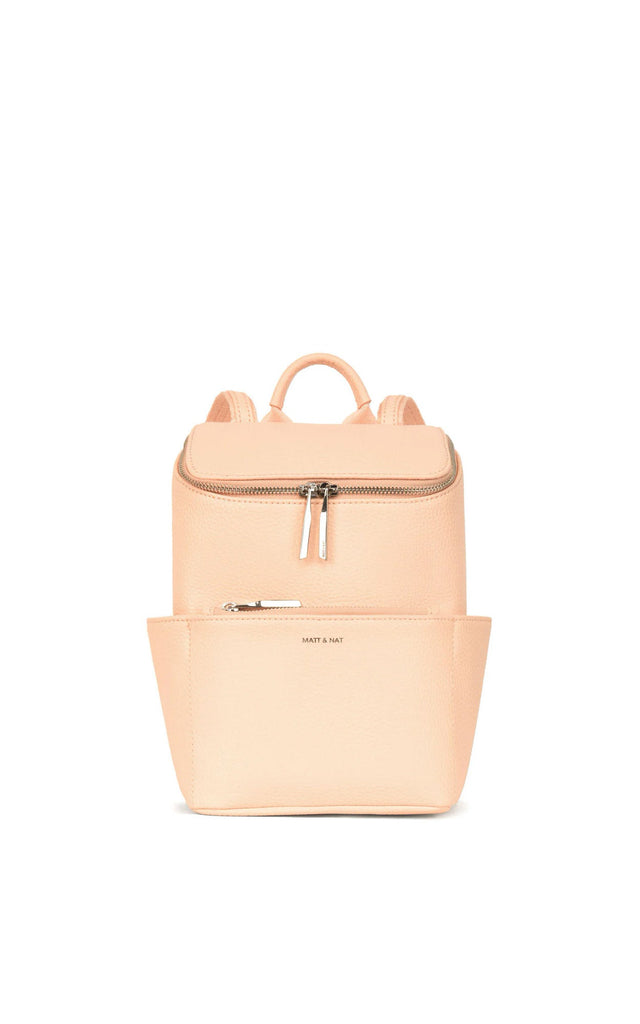 Small backpack with zip around top closure. Side slip pockets and front zipper pocket. Adjustable back straps.