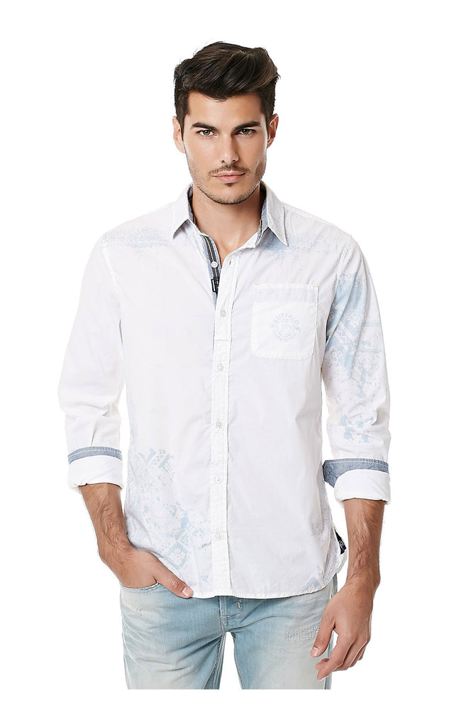 Une chemise blanche simple et confortable avec une touche de style. Chemise à col boutonné de Buffalo avec poche avant dotée de lettrage, poignets contrastants et imprimé graphique contrastant sur le devant et au dos. 98% coton, 2% spandex. Le mannequin porte une taille M. Mensurations: Taille: 6 pi x 2 po (188 cm), Tour de taille: 32 po (81 cm)