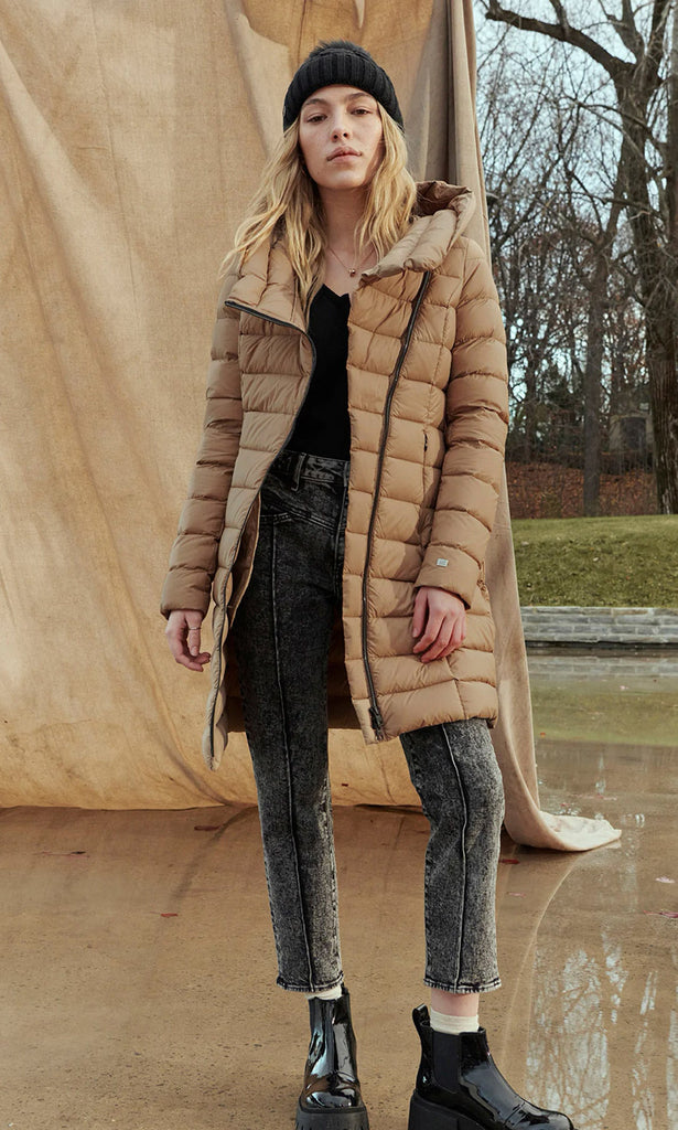 The KARELLE-TD by SOIA & KYO is a warm, stylish, and sustainable cold-weather closet staple. This slim-fit, above-knee puffer is made with RDS certified lightweight down and 100% recycled water-repellent quilted nylon. The asymmetrical front closure hugs the body, while the oversized hood provides extra shelter from the elements.
