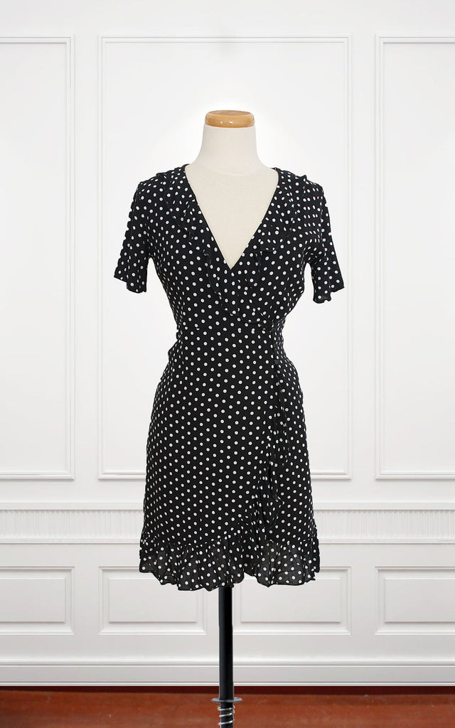 The Irresistible Dress is a wrap boho-chic polka dotted dress. It has a 40's vibe with its short sleeves and frill along the neckline and hem. Wear yours with a pair of cute sandals for a casual look. *If you're in between sizes, we recommand going for a size up since the dress is not strech.