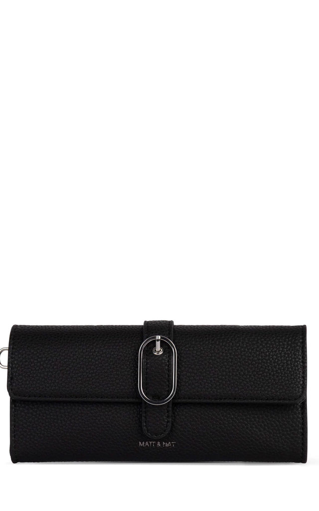 Portefeuille avec fermeture à rabat, détail de boucle décorative sur le rabat et un bracelet amovible.