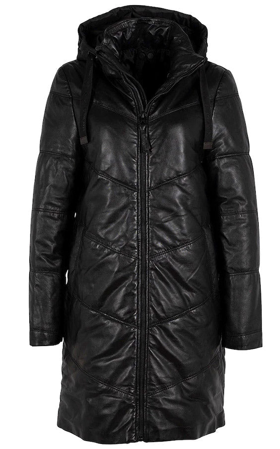 You'll add something special and warm to your cool weather look wearing the Vallie leather long puffer jacket with hood from Mauritius.